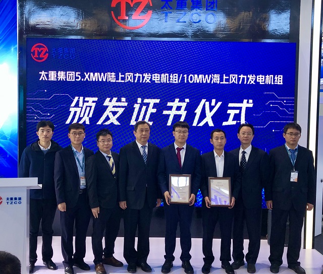 近日,在2021北京國際風能大會暨展覽會期間,我司為華銳風電科技(集團)股份有限公司研發(fā)的“6.25MW陸上風力發(fā)電機組”、太原重工新能源裝備有限公司研發(fā)的“10MW海上臺風型機組”及“5MW陸上平臺機組”頒發(fā)了產(chǎn)品認證證書。