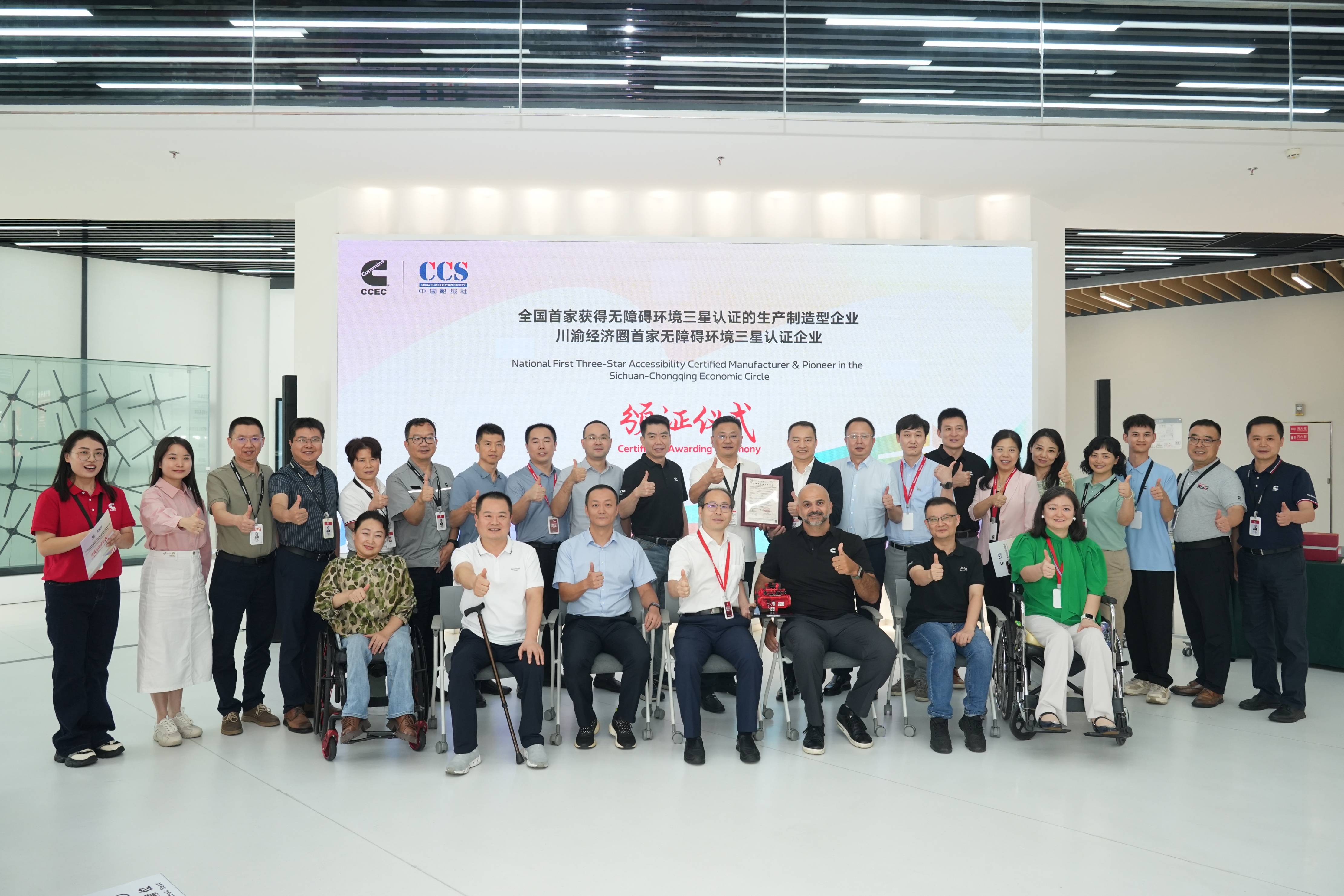 重慶分社副總經理曹宇晨也向康明斯發來了祝賀。他提出,此次重慶康明斯辦公大樓通過三星級無障礙環境認證,標志著康明斯與中國船級社的合作從船用領域延伸至更廣闊的工業服務與第三方認證范疇。認證公司作為中國船級社在工業領域的專業服務機構,可以為康明斯提供管理體系認證、綠色低碳、安全管理、ESG以及工業產品三方公正性檢驗等服務,全面深化合作范疇。